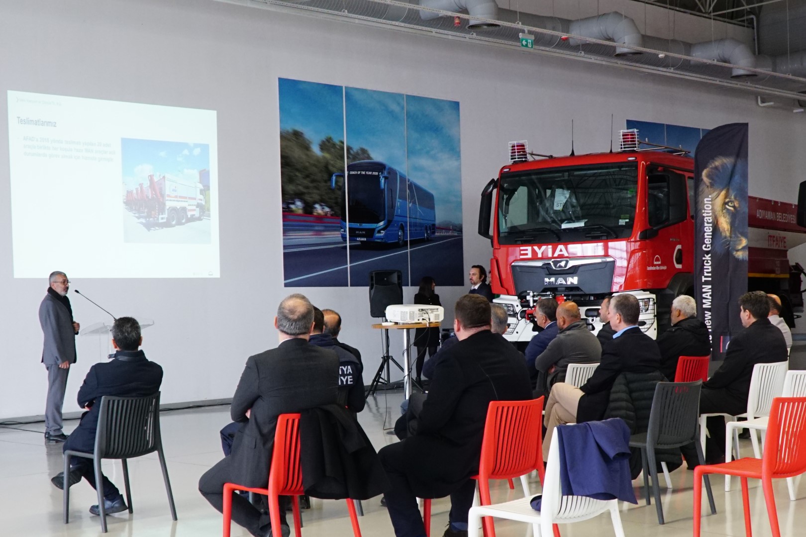 Kamyon ve Otobüs Ticaret A.Ş. adına Genel Müdür Tuncay Bekiroğlu, Kamyon Satış Direktörü Serkan Sara, Otobüs Satış Direktörü Can Cansu ve Kamu Satış Müdürü Taylan Aslanoğlu’nun da hazır bulunduğu teslimat törenine Kahramanmaraş Büyükşehir Belediyesi Genel Sekreteri Dr. Rüstem Keleş, Hatay Büyükşehir Belediyesi İtfaiye Daire Başkanlığından Veli Yıldır, Ahmet Öztürk, Gaziantep Büyükşehir Belediyesi İtfaiye Daire Başkanı Cafer Yılmaz, Malatya Büyükşehir Belediyesi Genel Sekreter Yardımcısı Latif Okyay İtfaiye Daire Başkanı Mustafa Katipoğlu ile Adıyaman Belediyesi Meclis Üyesi Muhittin İzci katıldı.