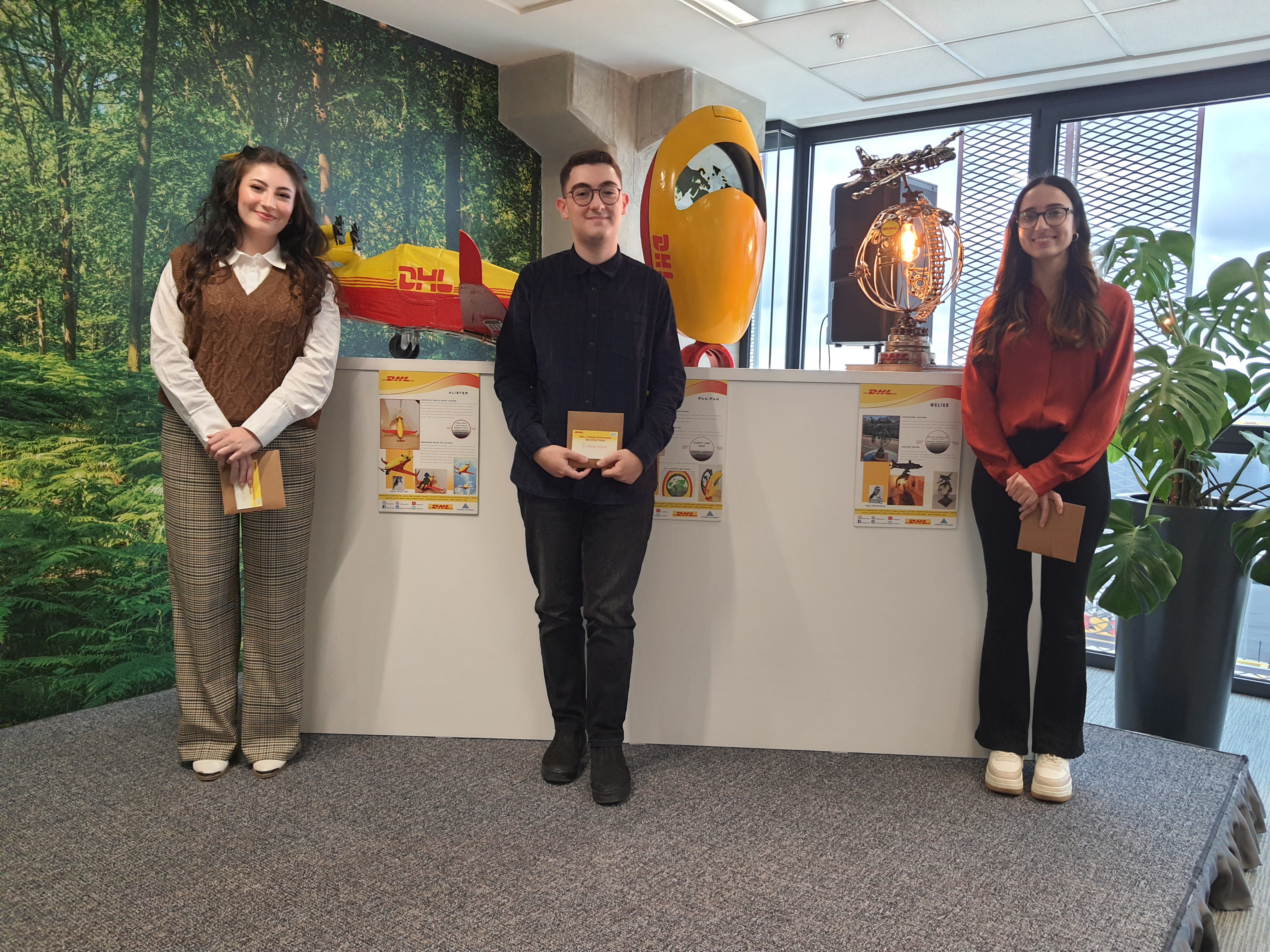 Yeditepe Üniversitesi Endüstriyel Tasarım Bölümü öğrencilerinden Doğa Çarıkçoğlu, DHL’in elektrikli uçağı Alice’den ilham alarak, atık cıvata ve metallerden yaptığı aydınlatma tasarımı “Welice” projesiyle birinci oldu. Eski bir sokak lambasını DHL uçağı formunda kâğıt atık toplama kutusuna dönüştüren Baran Çulban “Pan Pan” adlı projesiyle ikinci seçildi. “Alister” projesiyle üçüncü olan Dilara Damla Üst ise atık kumaş, ahşap ve metalden, DHL kargo uçağından esinlenerek çocuklar için kaykay tasarladı.