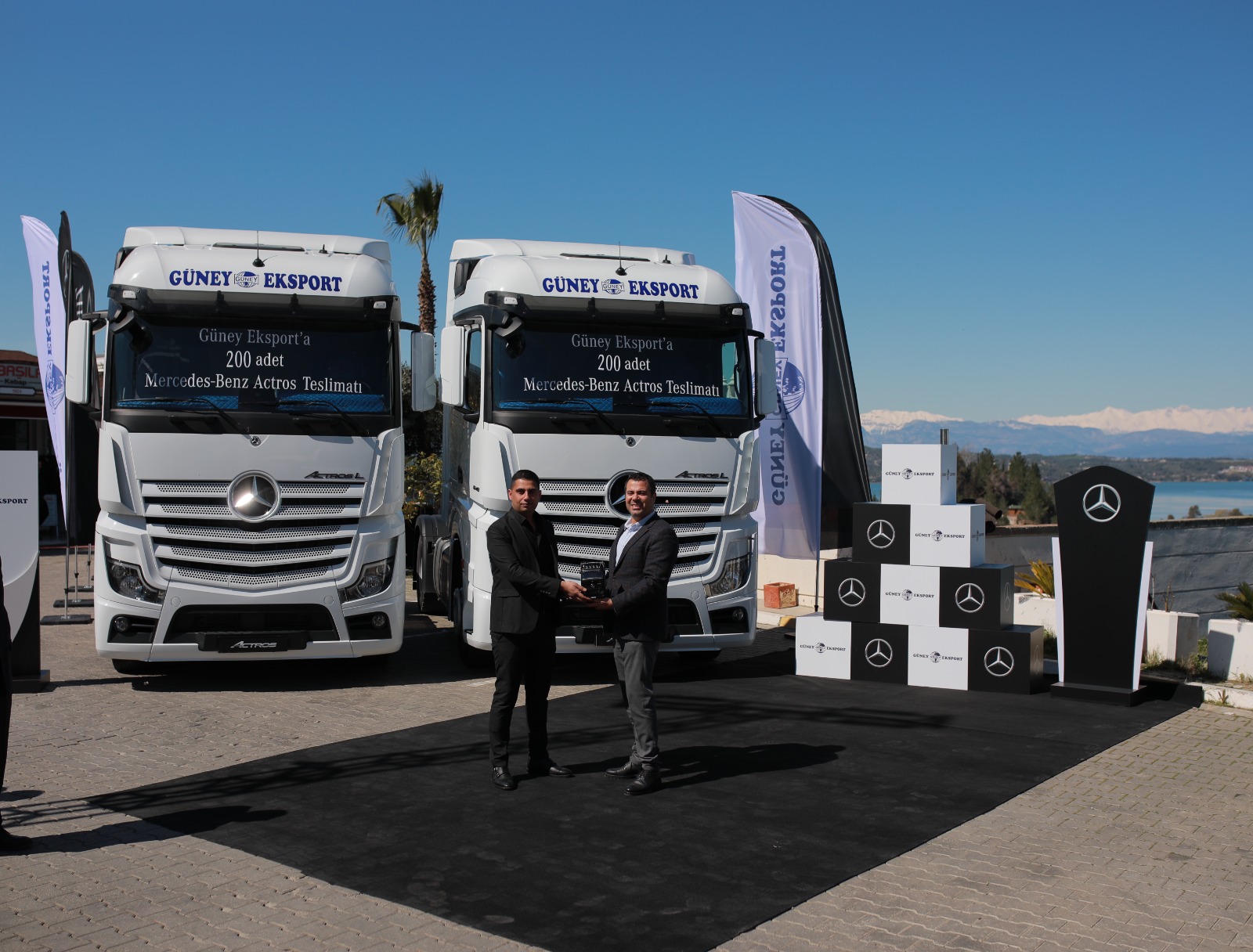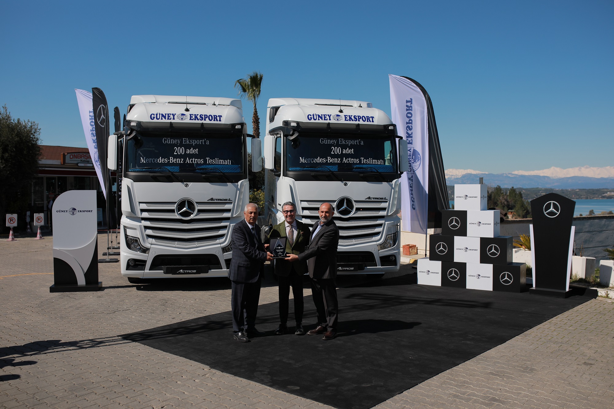 Mercedes-Benz Finansal Hizmetler’in kredi desteğiyle Mercedes-Benz Türk bayisi Heska tarafından satış işlemleri yapılan araçlar için 16 Mart 2022 tarihinde Adana Onbaşılar Kebap’ta yüksek katılımla teslimat töreni gerçekleştirildi. Düzenlenen törende araçlar; Mercedes-Benz Türk Kamyon Pazarlama ve Satış Direktörü Alper Kurt, Mercedes-Benz Türk Kamyon Filo Satış Grup Müdürü Yusuf Adıgüzel, Mercedes-Benz Türk Satış Sonrası Hizmetler Direktörü Tolga Bilgisu, Mercedes-Benz Türk Kamyon & Otobüs Pazarlama İletişimi ve Müşteri Yönetimi Grup Müdürü Serra Yeşilyurt, Mercedes-Benz Türk Kamyon Ürün Yönetimi Grup Müdürü Çağdaş Özen, Heska Yönetim Kurulu Başkanı Hekim Toloğ, Heska Yönetim Kurulu Üyesi Hamdi Yüncü, Heska Kamyon Satış Müdürü İlyas Toloğ tarafından Güney Eksport Yönetim Kurulu Başkanı Abdulkadir Şimşek, Güney Eksport Yönetim Kurulu Başkan Yardımcısı Mehmet Aksoy, Güney Eksport Yönetim Kurulu Üyesi Latif Şimşek, Güney Eksport Yönetim Kurulu Üyesi Halil İbrahim Aksoy, Güney Eksport Yönetim Kurulu Üyesi Hakan Aksoy ve Güney Eksport Genel Müdürü Ömer Aksay’a teslim edildi.