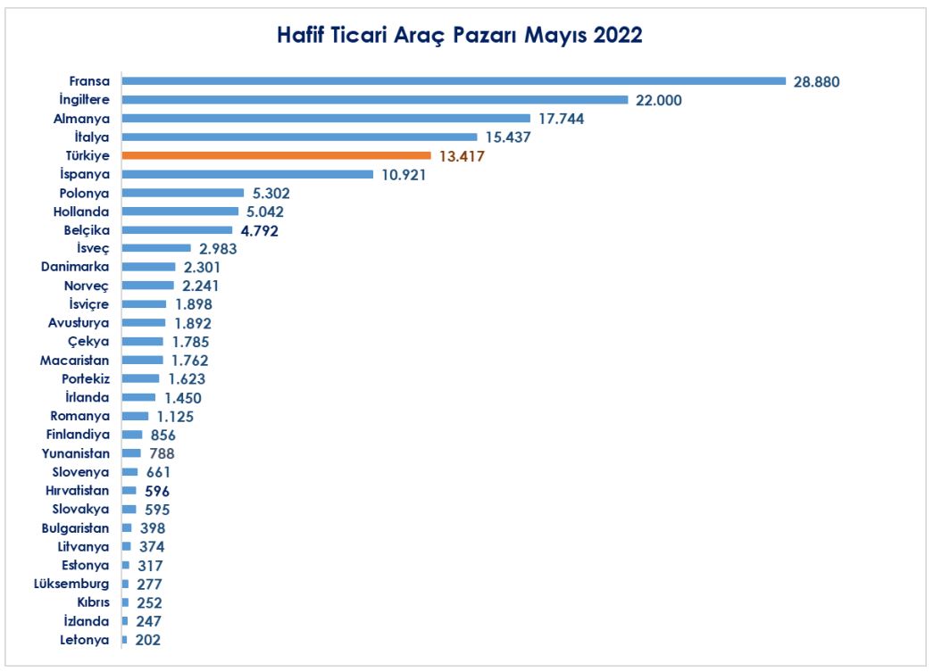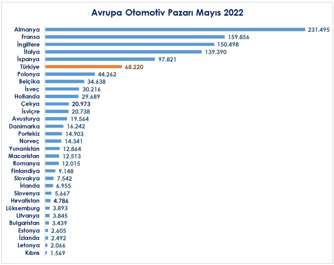 2022 yılı Ocak-Mayıs döneminde Türkiye geçen yıla göre %11,5 azalış ile Avrupa otomotiv satışları sıralamasında 6. ülke, %13,6 düşüş ile Avrupa otomobil satışları sıralamasında 6. ülke ve %5,7 azalış ile Avrupa hafif ticari araç satışları sıralamasında 5. ülke olarak yer aldı.