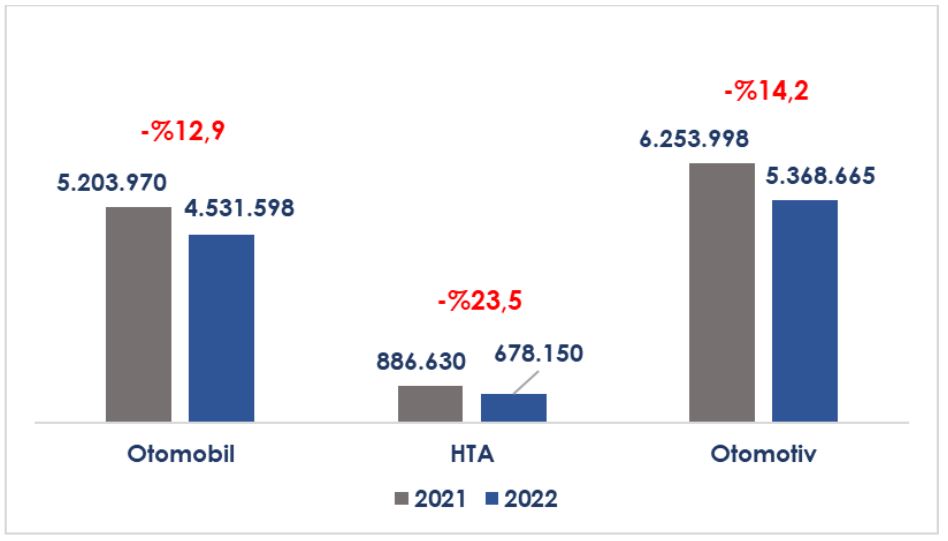 Otomotiv pazarı 2022 yılı Ocak-Mayıs döneminde %14,2 azaldı ve 5.368.665 adet seviyesinde gerçekleşti. 2021 yılının aynı döneminde 6.253.998 adet toplam satış gerçekleşmişti.