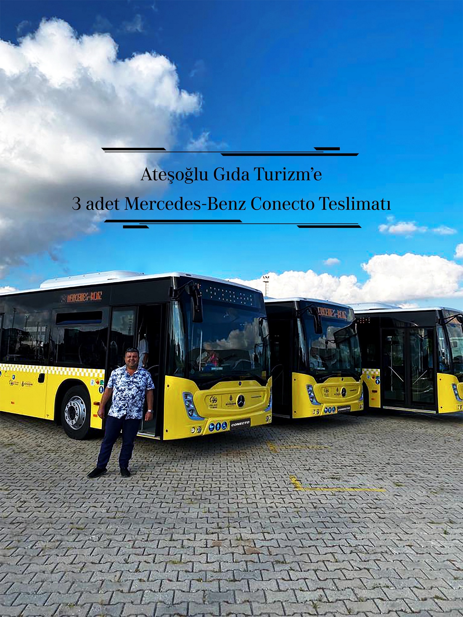 Ateşoğlu Gıda Turizm, İstanbul’da şehir içi yolcu taşımacılığı alanında kullanılmak üzere 3 adet 2022 model Mercedes-Benz Conecto Solo otobüsü törenle teslim aldı. Hoşdere Otobüs Fabrikası’nda üretilen araçların satış işlemleri kapsamında, BusStore tarafından 3 adet 2016 model Conecto Solo araç takasa alındı.