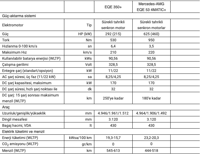 EQE, 292 HP (215 kW) gücündeki EQE 350+ ve 625 HP (460 kW)’lik Mercedes-AMG EQE 53 4MATIC+ olmak üzere ilk etapta iki farklı versiyonla piyasaya sürülüyor. Mercedes-AMG EQE 53 4MATIC+, Mercedes-AMG’nin elektrikli sürüş performansı için en üst seviyeyi oluşturuyor. EQE 350+’nın bataryası yaklaşık 90 kWsa kullanılabilir enerji kapasitesine sahip olup WLTP’ye göre 613 km’ye kadar menzil sunuyor.
