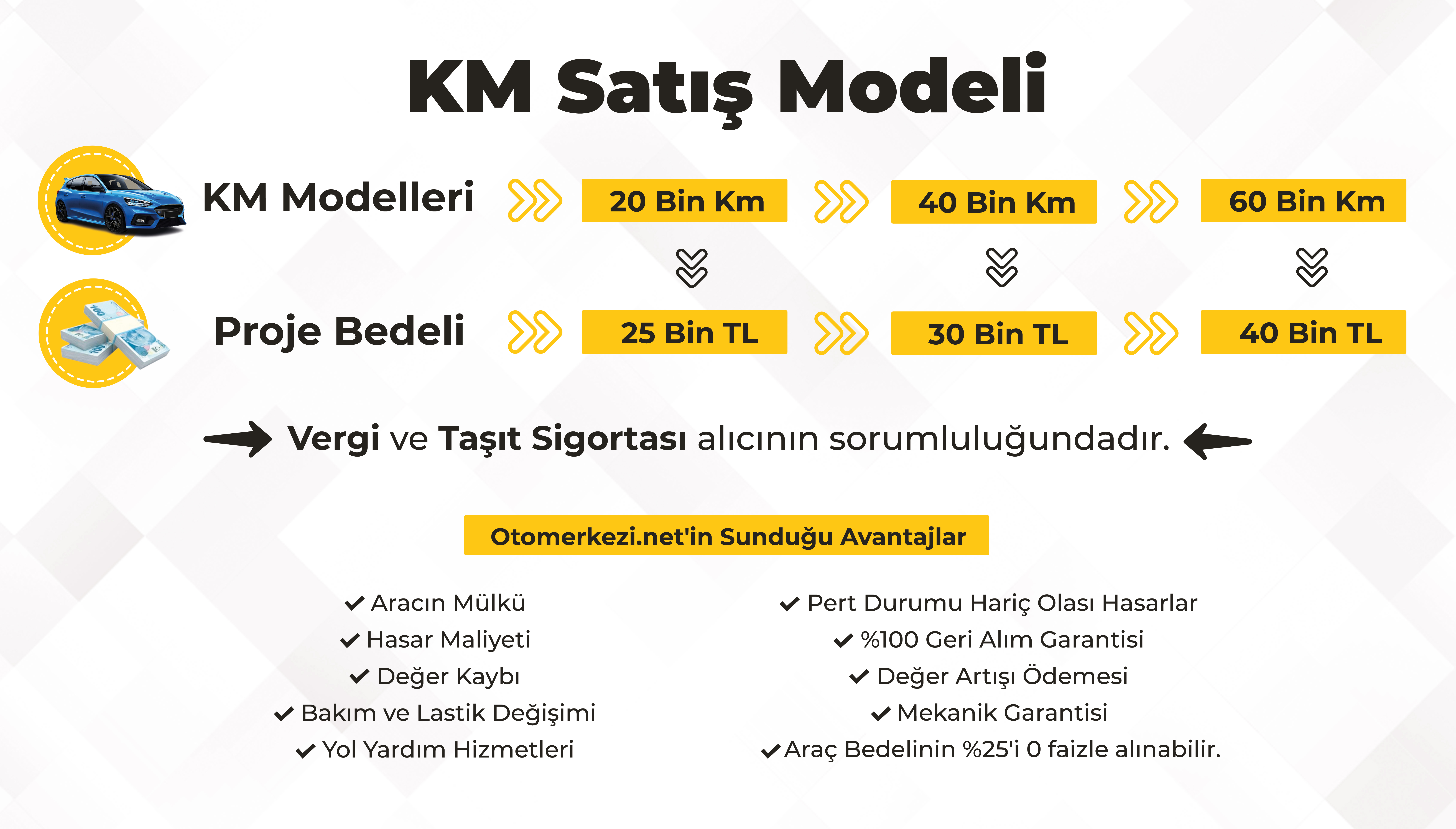 Faiz oranlarının bir hayli yüksek olduğu bu dönemde, uygulamaya dahil olan tüketicilerin, satın alınan araç bedelinin yüzde 25’i oranında, yüzde 0 faizli kredi avantajını da bu modelle birlikte Otomerkezi.net bünyesinde kullanılabildiğine dikkat çeken Karakaş, “Kampanyamız kapsamında tüketiciler otomobilin değerinin yüzde 25’i oranında 0 faizli kredi kullanma şansına da erişiyor. Otomobilde oluşan hasarlar, dönemsel servis bakımları, lastik değişimi, ağır bakım, periyodik bakım, hepsini Otomerkezi.net karşılıyor. Klima gazının dolumunu ya da ihtiyaç olduğu takdirde motor revizyonuna kadar biz karşılıyoruz. Tüketici sadece otomobili kullanmaya konsantre oluyor, üstelik otomobilin mülkiyeti de tüketiciye ait olacak. Bu sayede uzun dönem kiralamadan farklı olarak, tüketici yatırımıyla kendini güvende hissedecek. 30 şubemizde geçerli olacak ve pilot uygulama olarak Maltepe Genel Merkezi’mizde başlattığımız satış modelimizde sırasıyla 20 bin kilometre için 25 bin TL, 40 bin kilometre için 30 bin TL, 60 bin kilometre için 40 bin TL ödeme gerçekleştirilecek. Bunun dışında başka ödeme söz konusu değil ve en önemlisi tüketici dilerse kilometreyi 6 ayda, dilerse 20 yılda tamamlayabilir, süre kısıtlaması yok.” şeklinde detayları paylaştı.