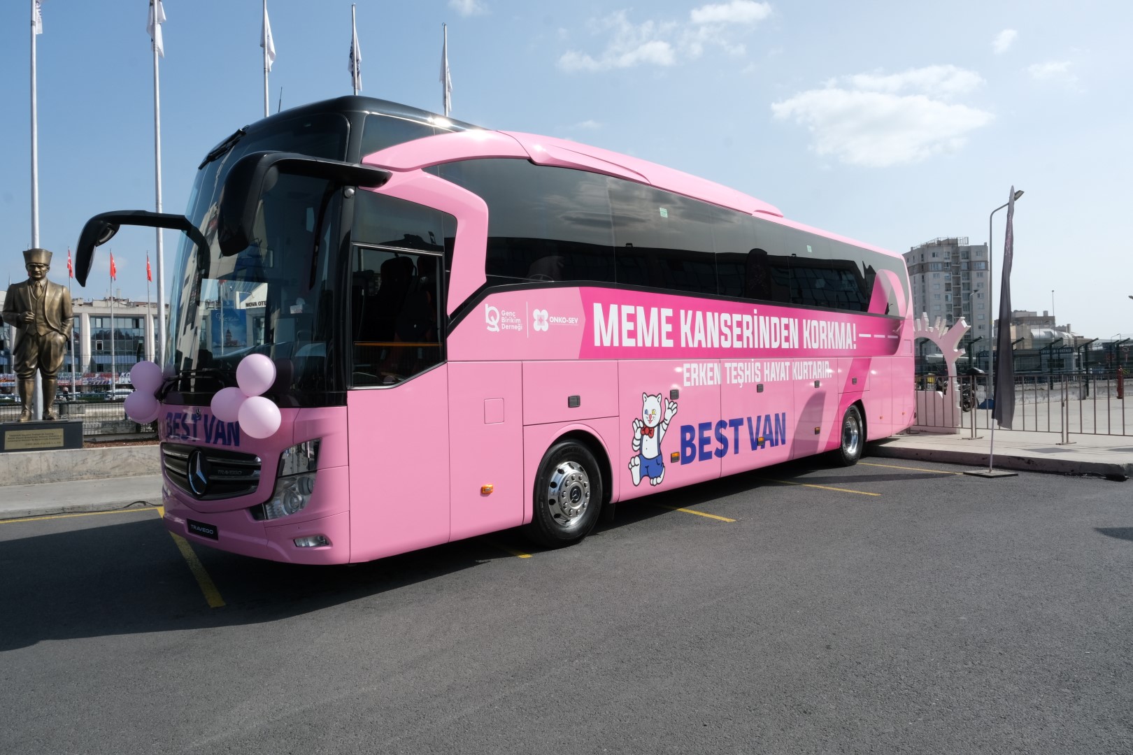 Mercedes-benz Türk Ve Best Van Turizm’in 2022 Yılında Gerçekleştirdiği İş Birliği Sonucu Pembe Renkte Giydirilen Mercedes-benz Travego 16 2+1 Otobüs, Bu Yıl Yeni Tasarımı Ve Sloganı İle Toplum Sağlığı İçin Yeniden Yollarda. 2022 Yılında Best Van Turizm Filosuna Katılarak ‘erken Teşhis Hayat Kurtarır’ Sloganıyla Yola Çıkan Araç, 1 Yıl İçinde 30 Bin Yolcuyu Misafir Ederken 300 Bin Kilometreden Fazla Da Yol Kat Etti. 2023 Yılı ‘meme Kanseri Bilinçlendirme Ve Farkındalık Ayı’ Kapsamında Tasarımı Yenilenen Araç, Basın Mensupları, Mercedes-benz Türk Ve Best Van Turizm Yöneticilerinin De Katılım Sağladığı Etkinlik İle Büyük İstanbul Otogarı’nda Yeni Yolculuğuna Uğurlandı