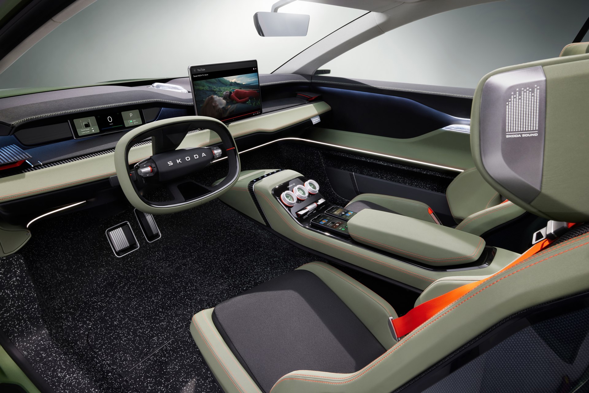 VISION 7S konseptinin kabini, ŠKODA’nın kendine has geniş kabin fikrini daha da ileriye taşıyor. Koyu ve açık renkli materyaller kombine edilirken deri olmadan tasarlanan kabinin büyük bir kısmı, sürdürülebilir kaynaklardan gelen malzemelerden üretildi.