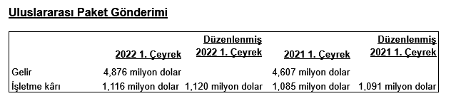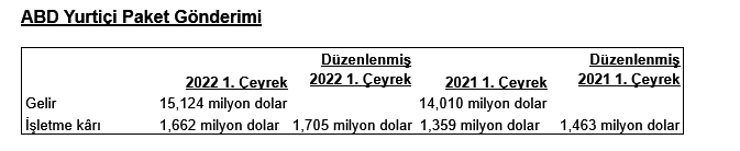 UPS, 2022 birinci çeyreğine ilişkin konsolide gelirin, 2021 birinci çeyreğine oranla yüzde 6,4 artarak 24,4 milyar dolara yükseldiğini açıkladı. Konsolide işletme kârı, 2021’nin birinci çeyreğine kıyasla yüzde 17,6 artış ve düzenlenmiş bazda yüzde 12,1 artış ile 3,3 milyar dolar oldu. Hisse başına seyreltilmiş kazanç bu çeyrek için 3,03 dolar olarak gerçekleşti; 3,05 dolarlık hisse başına düzenlenmiş seyreltilmiş kazanç ise 2021’nin aynı dönemine göre yüzde 10,1 artış gösterdi.