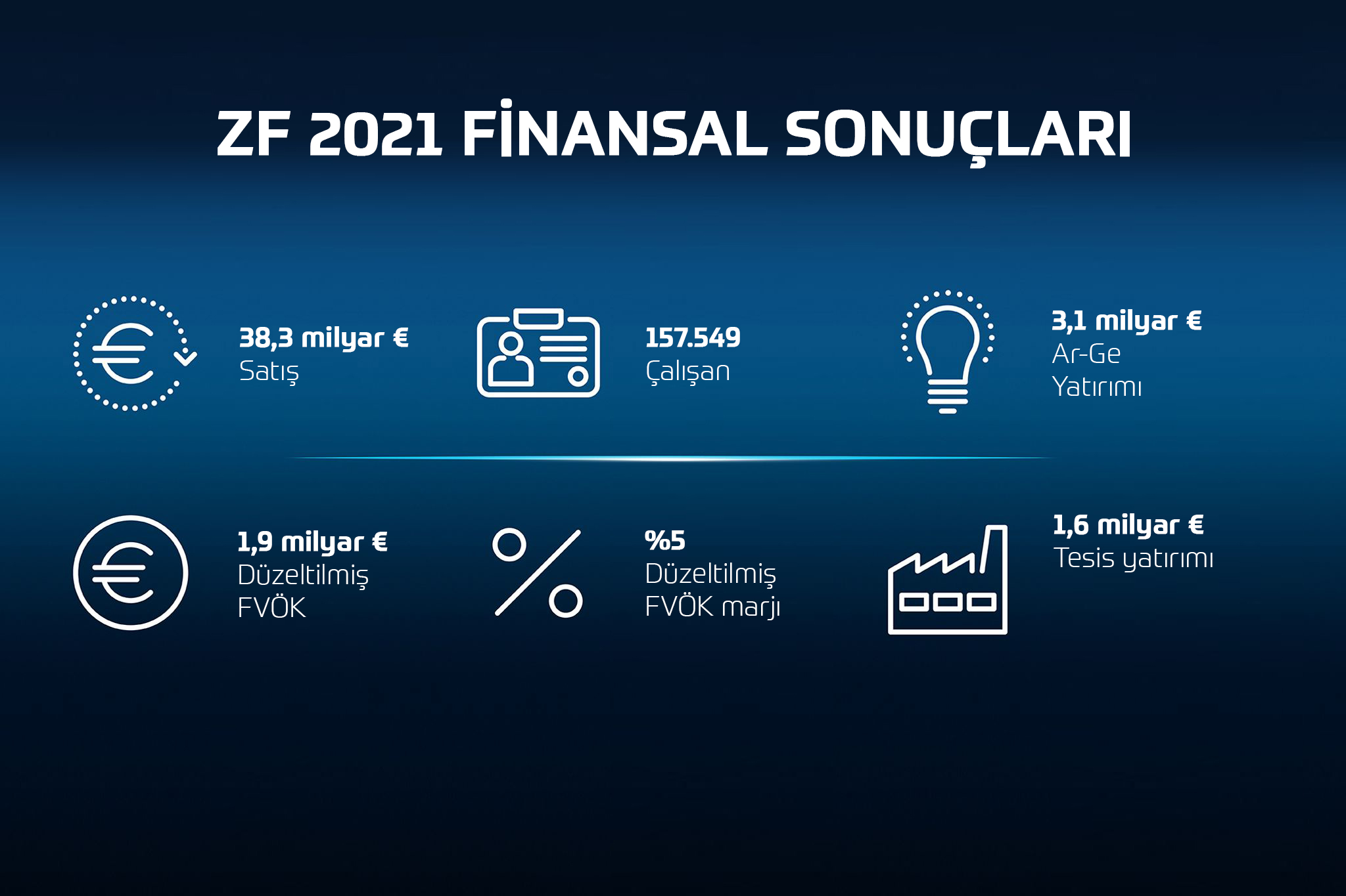ZF, tüm yıl boyunca, grup satışlarını yıllık yüzde 17,5 artışla 38,3 milyar Euro olarak gerçekleştirdi. Düzeltilmiş FVÖK 1.910 milyon Euro olurken, düzeltilmiş FVÖK marjı yüzde 5’e yükseldi. Birleşme ve satın alma faaliyetleri için ayarlanan serbest nakit akışı 991 milyon Euro olurken, brüt borç 752 milyon € azalarak 12,5 milyar €’ya düşürüldü. ZF CFO’su Dr. Konstantin Sauer, konuyla ilgili olarak “Bu, yalnızca önemli yatırımlar yapmakla kalmayıp, aynı zamanda finansal yükümlülüklerimizi azaltıp öz kaynak oranımızı güçlendirdiğimiz anlamına geliyor.” diye açıkladı.